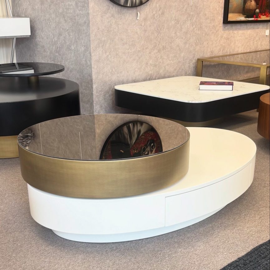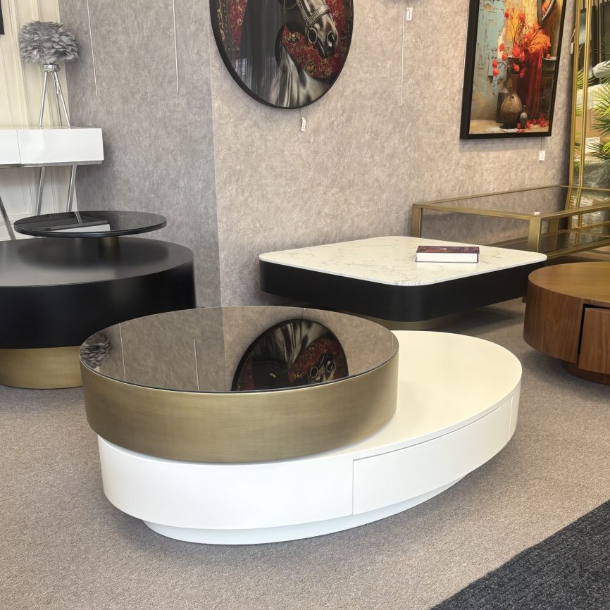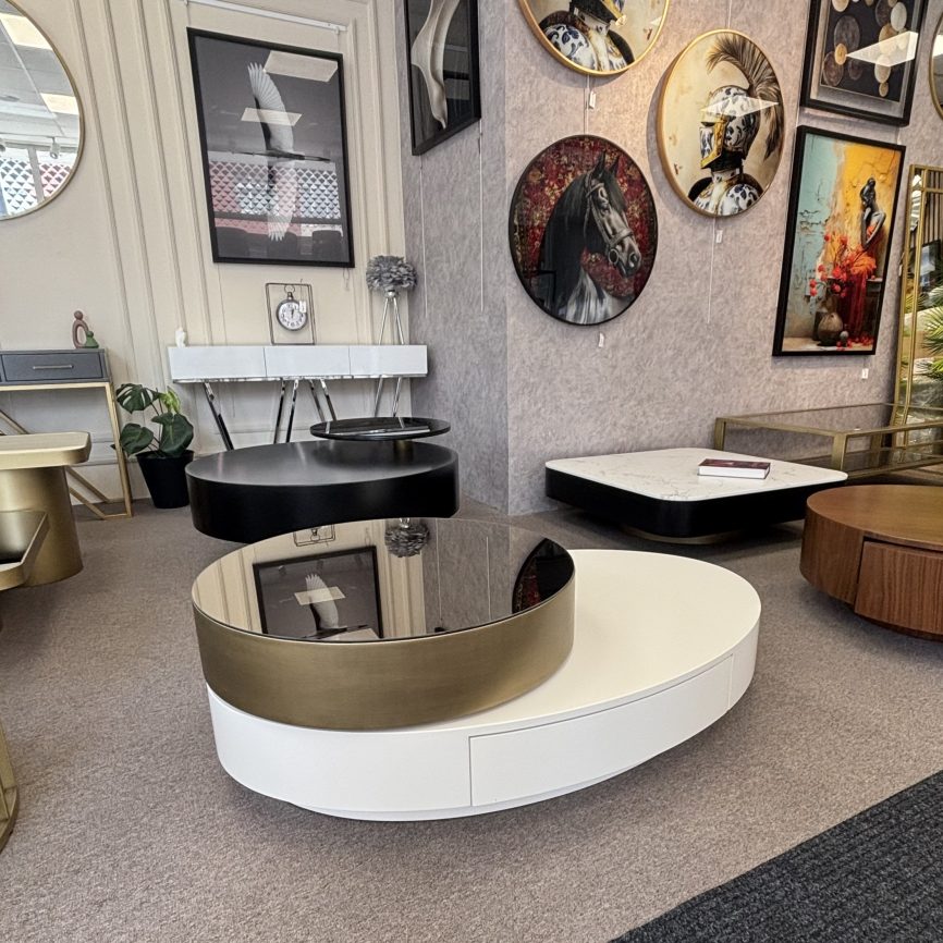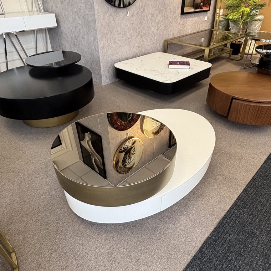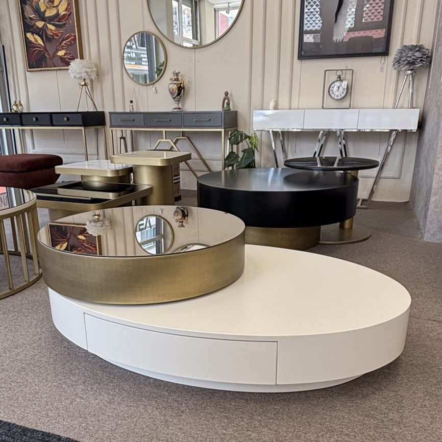 - Malzeme: Paslanmaz metal ayaklar, renkli ayna / lake MDF üst tabla