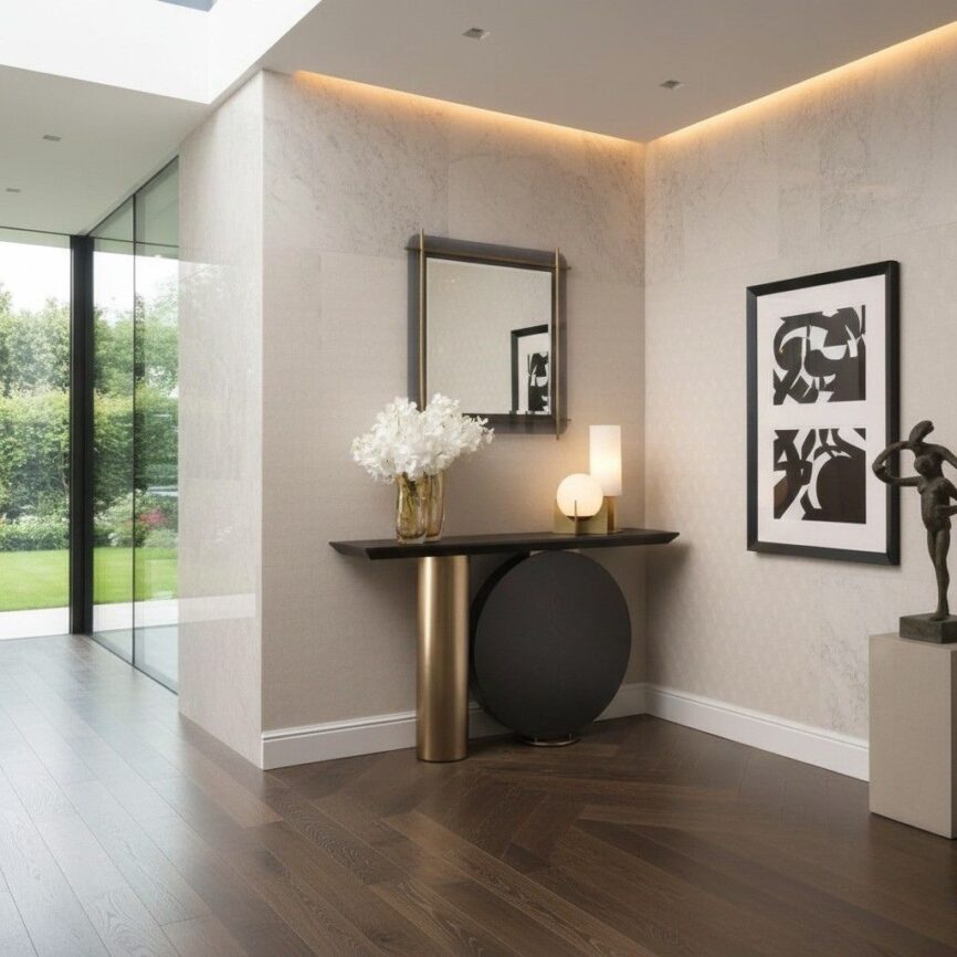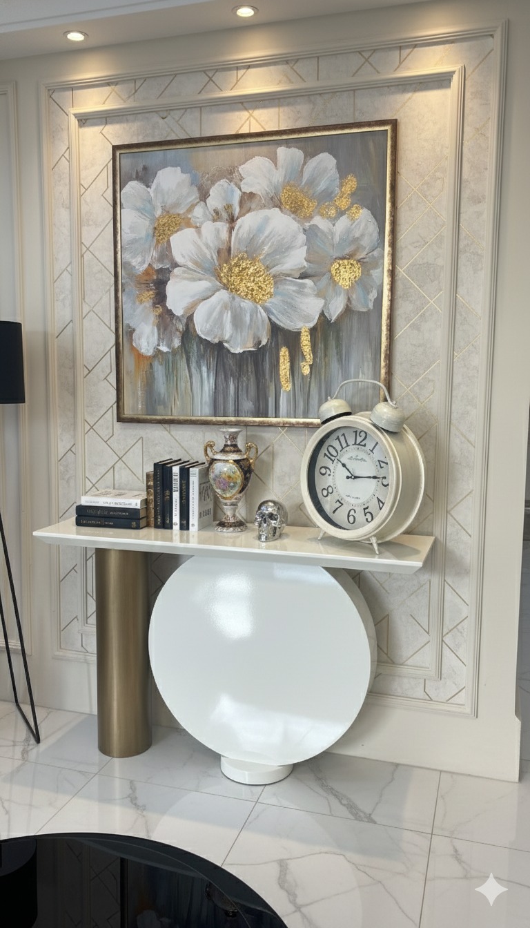 Duvarda süzülüyormuş gibi görünen şık, siyah lake masa tablasına sahip bu parça, çarpıcı, heykelsi eskitme ayaklarıyla öne çıkıyor. Üç zarif kavisli destek, güçlü bir Art Deco estetiği sunarken, minimalist profili ise her türlü çağdaş veya lüks ortama mükemmel uyum sağlamasını garantiliyor.